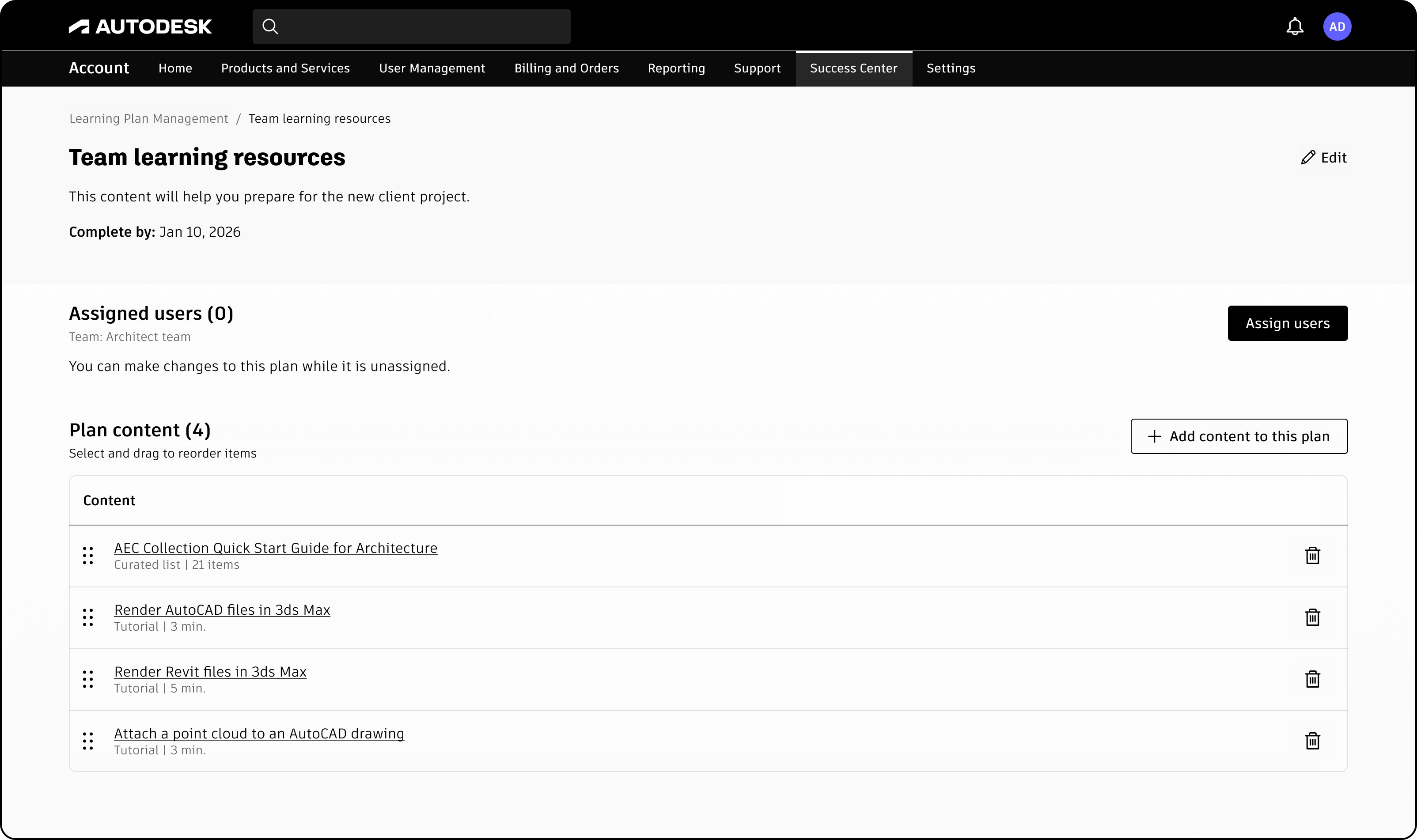 One of the keys to your team's success is the ability to stay up to date with knowledge about products and technologies related to your strategic objectives. If you're an admin with an Autodesk Business Success Plan, you can create learning plans right in the Success Center of your Autodesk account. You compose your plan by choosing tutorials, curated lists, modules, collections, and other items from Autodesk's catalog of on-demand learning content. Then you assign members of your team to the plan. Assigned members will receive an email notifying them of the learning plan and inviting them to consume the content on Autodesk's Learn site. You'll be able to track their progress in the Success Center.
