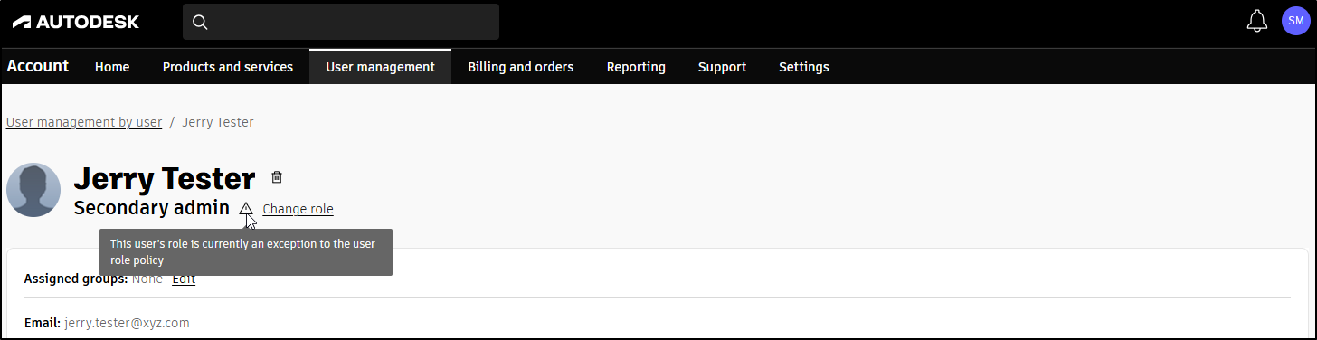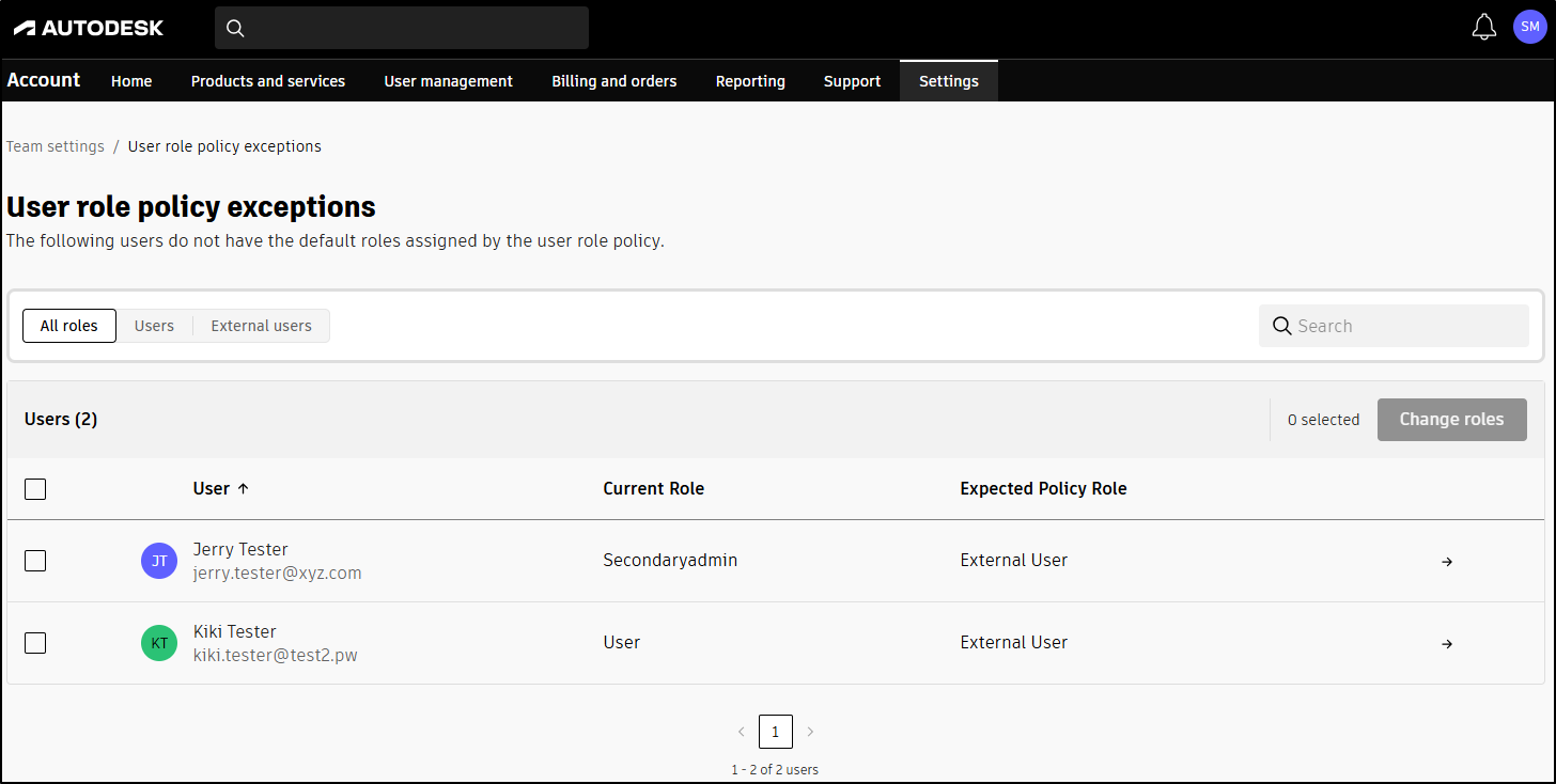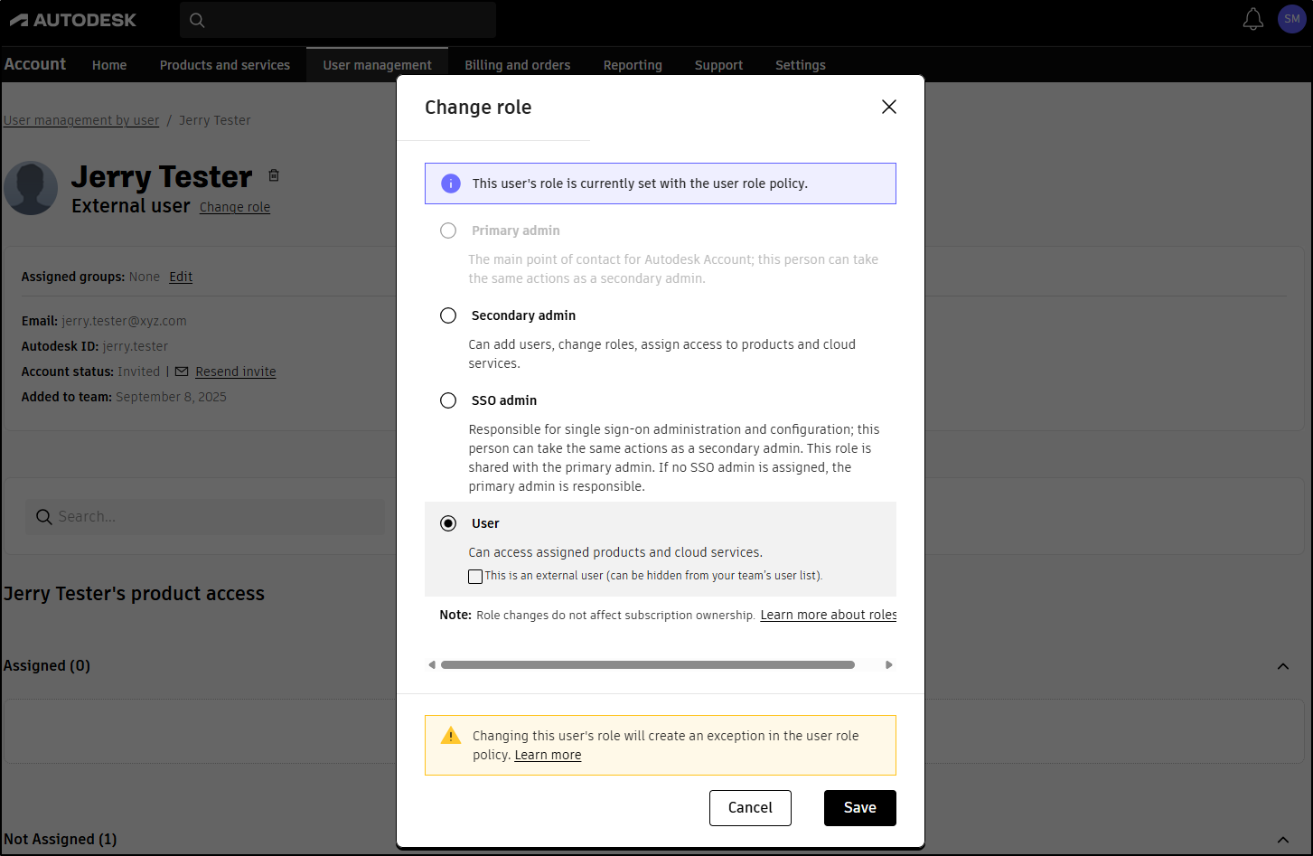 If you add a user whose email domain isn’t in your domain policy, Autodesk marks that user as external. This happens whether you add the user through an Autodesk cloud collaboration product or directly in Autodesk account user management. We always follow your domain policy when setting user roles.