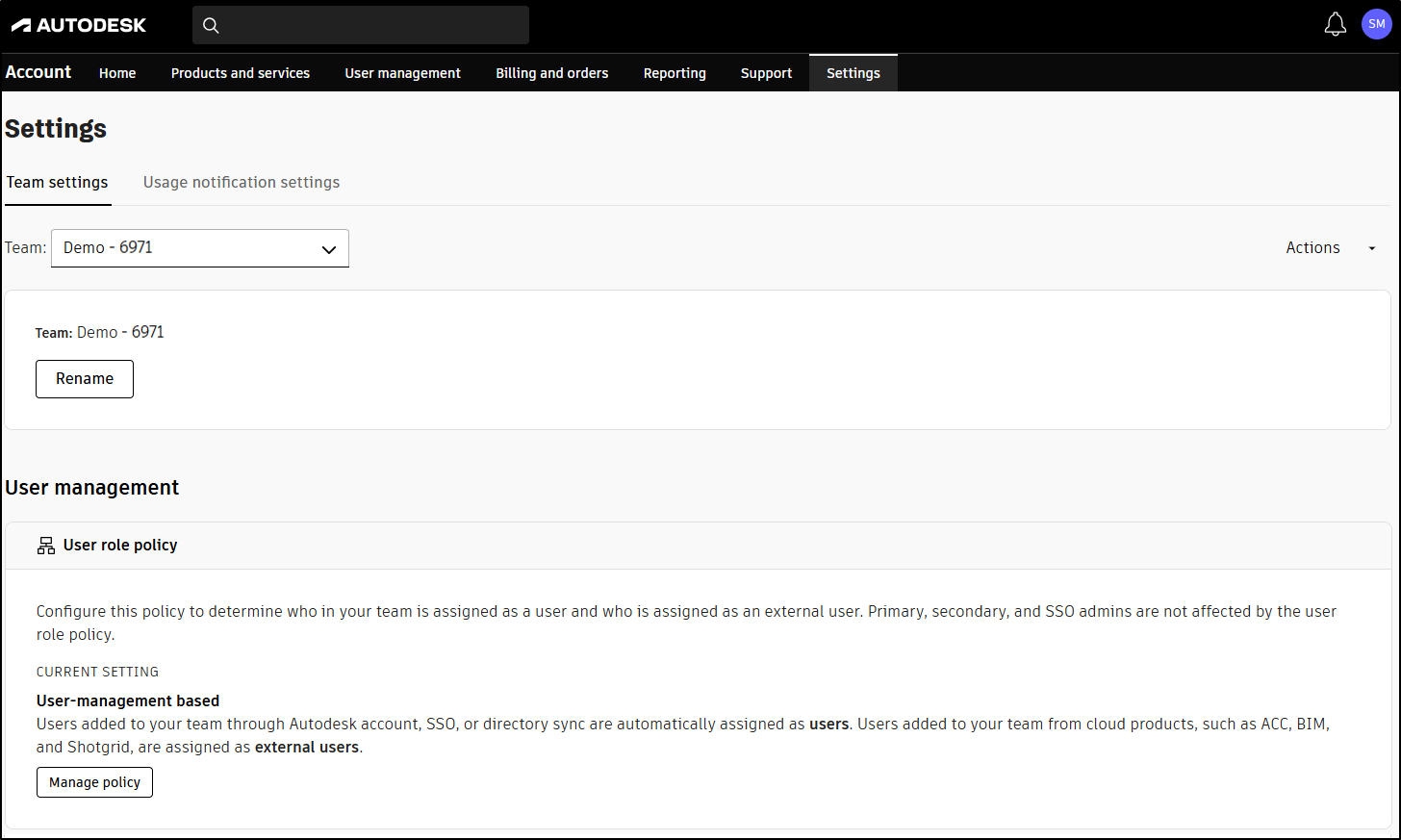 When you use the default user management based policy, anyone added to your team through an Autodesk cloud collaboration product, like Autodesk BIM Collaborate Pro, Autodesk Build, or Autodesk Takeoff, is automatically set as an external user in the Autodesk account.
